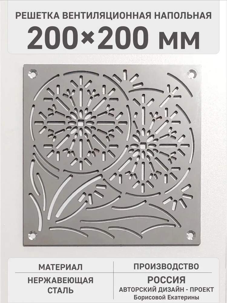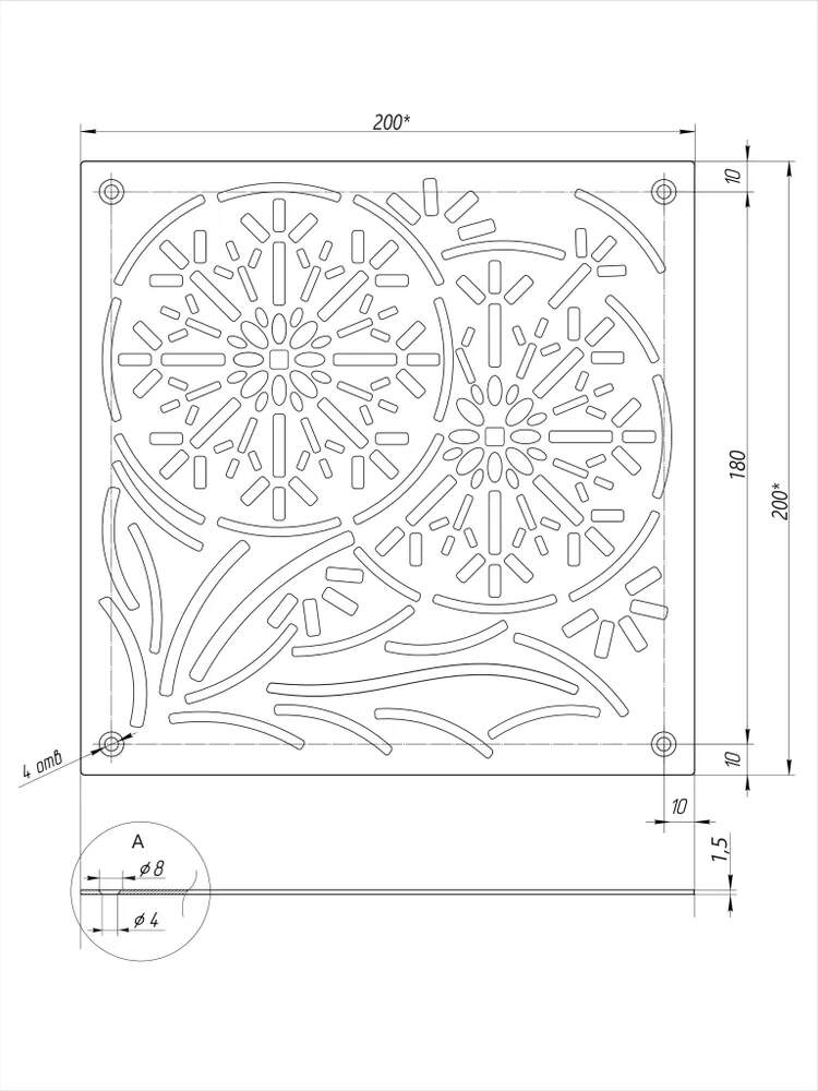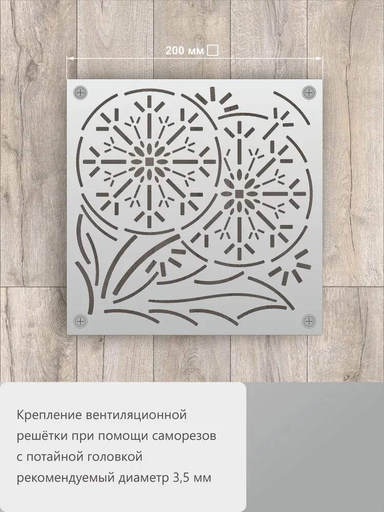 Квадратная вентиляционная решётка размером 200×200 мм с изящным узором «Одуванчик» представляет собой идеальное сочетание функциональности и декоративных качеств. Крупный формат изделия делает его особенно востребованным для организации вентиляции в просторных помещениях и общественных зонах.