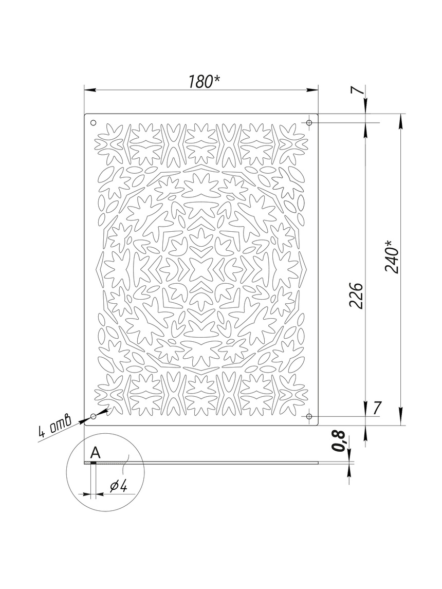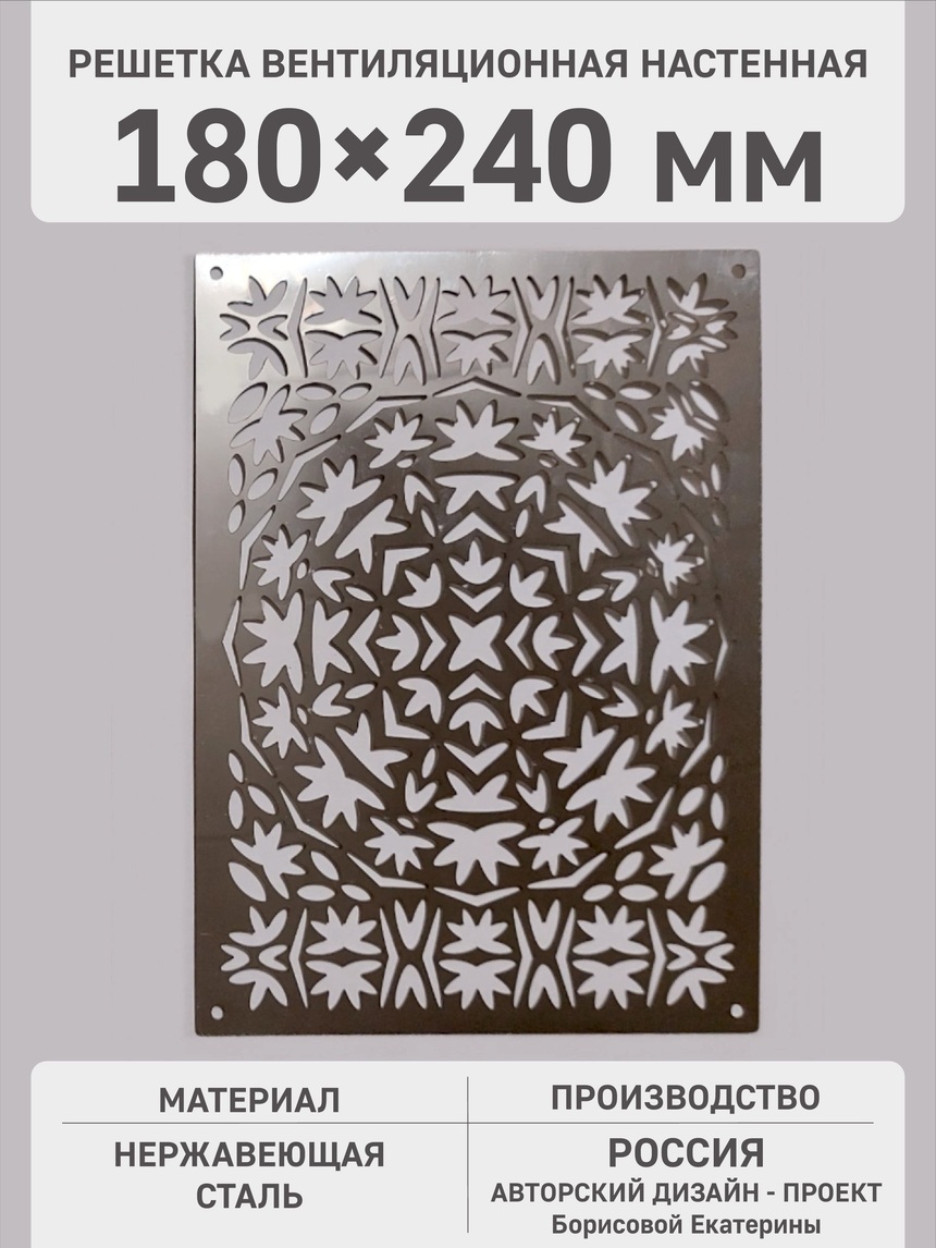 Изготовлена методом лазерной резки из цельного листа нержавеющей стали AISI 304 толщиной 0,8 мм. Ажурный осенний орнамент и перфорация (площадь живого сечения ~36%) создают высокую пропускную способность, не задерживая пыль и мусор.