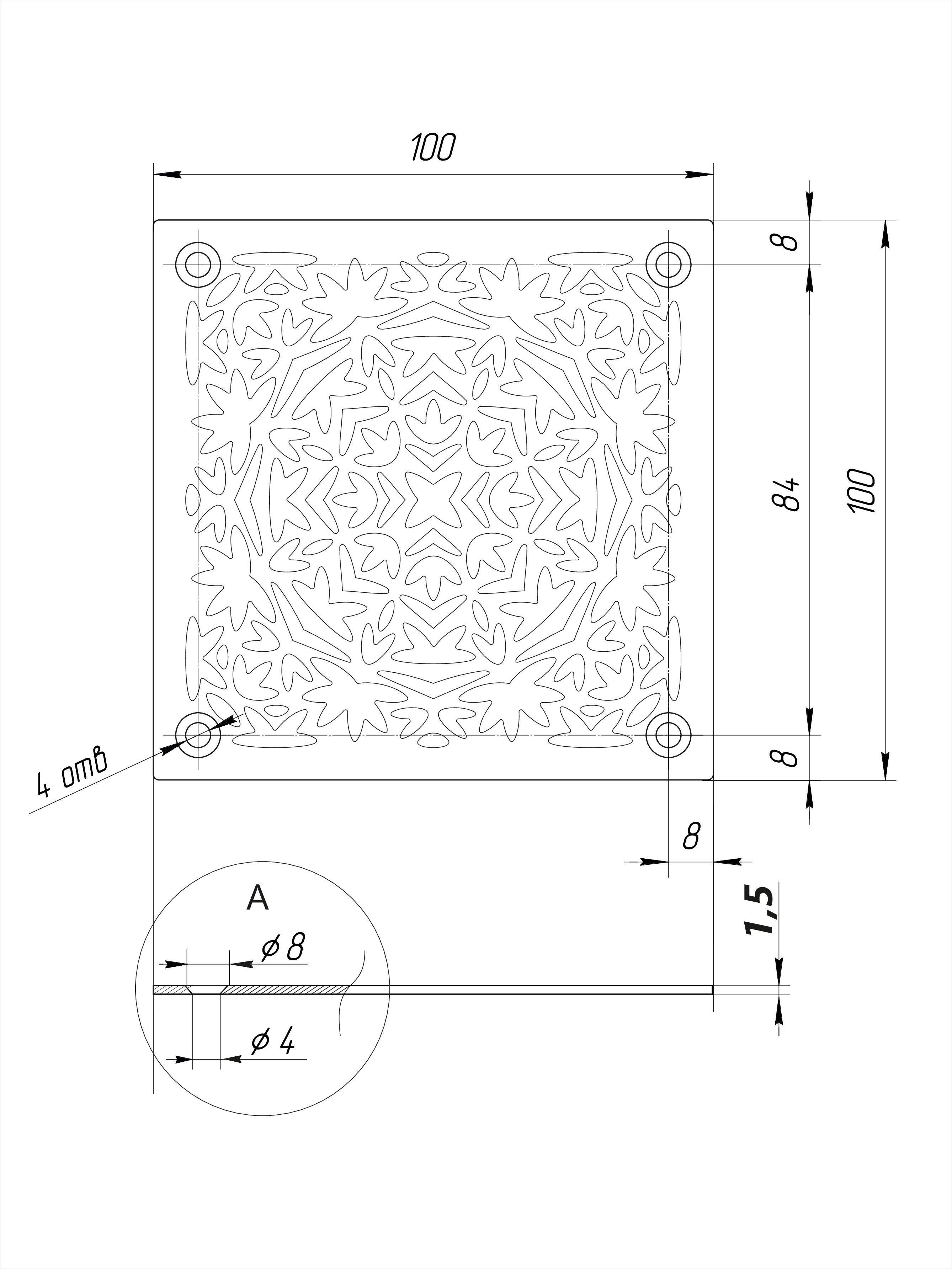 Ажурный узор, выполненный методом лазерной резки на листах стали AISI 304, толщиной 1,5 мм. Решётка из такого металла не требует специального ухода.
