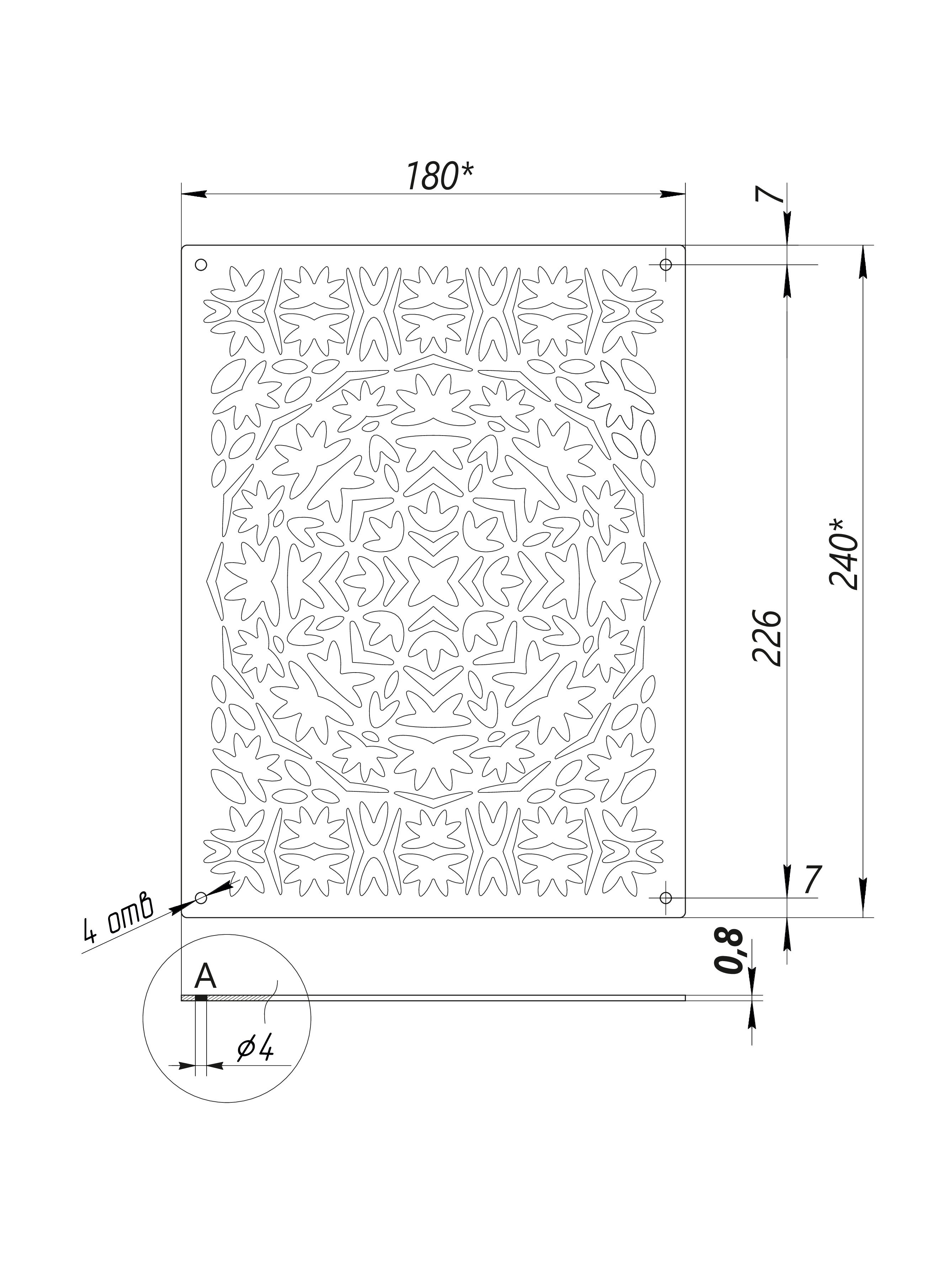Изготовлена методом лазерной резки из цельного листа нержавеющей стали AISI 304 толщиной 0,8 мм. Ажурный осенний орнамент и перфорация (площадь живого сечения ~36%) создают высокую пропускную способность, не задерживая пыль и мусор.