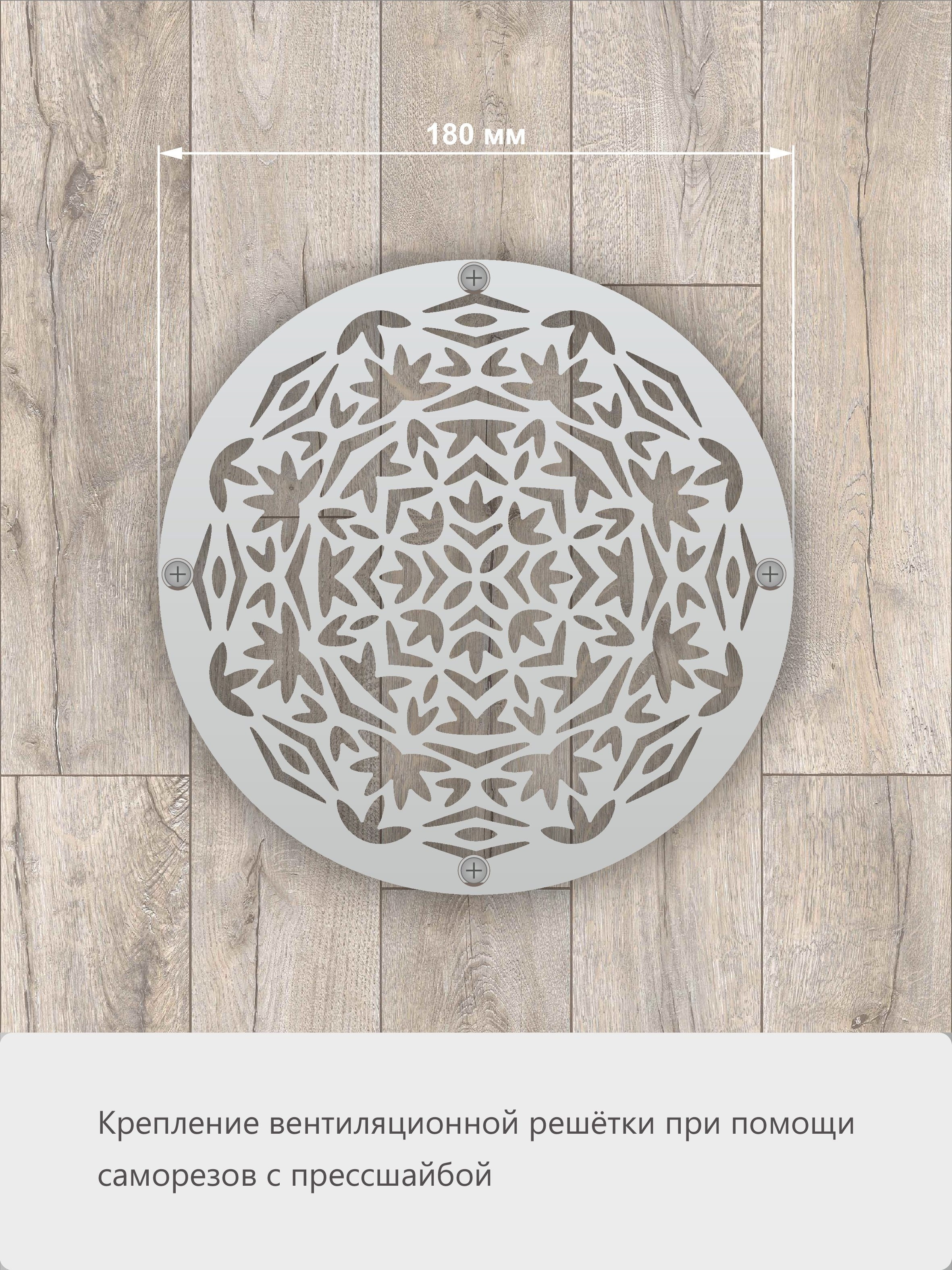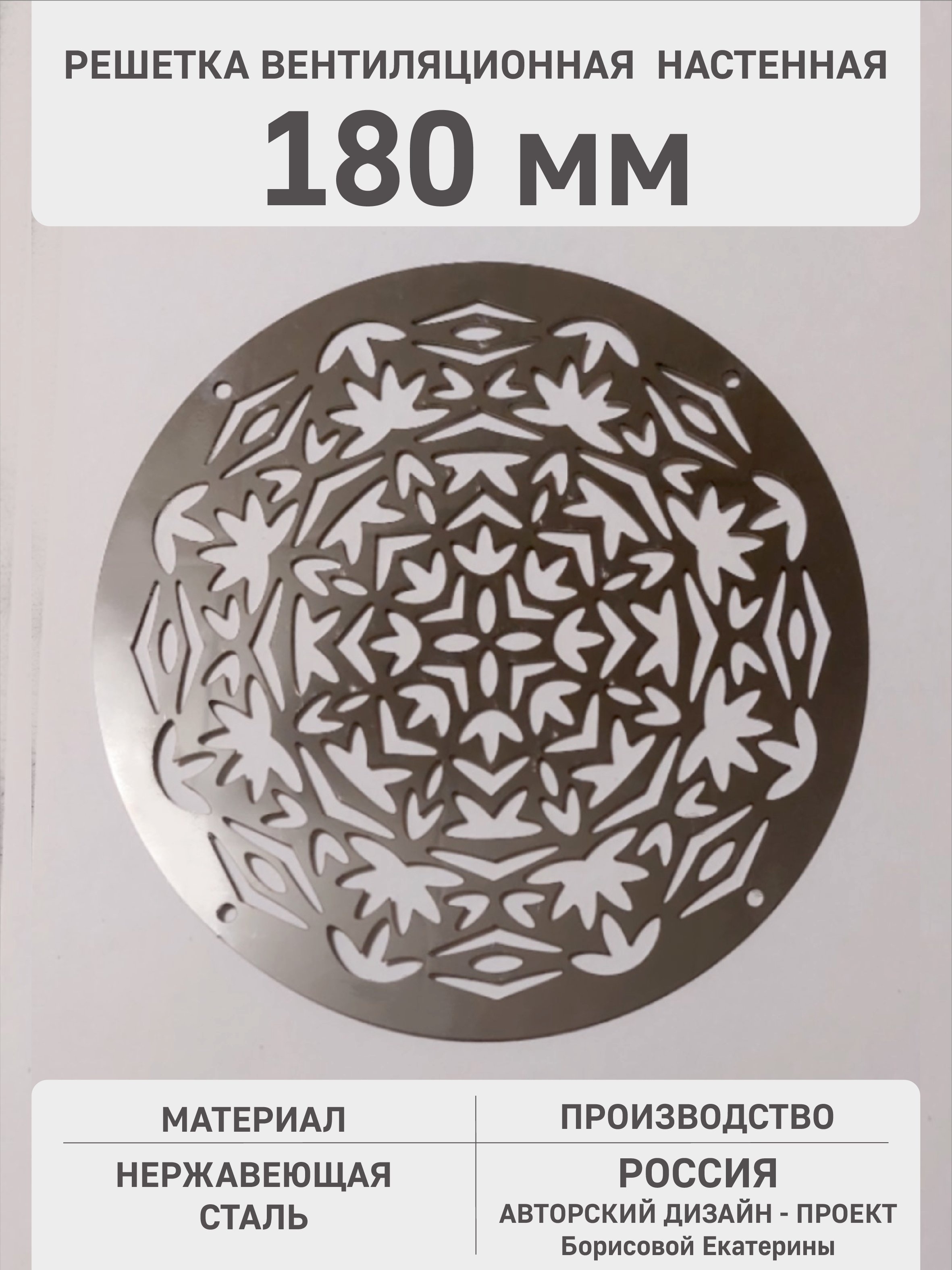 Металлическая решётка «Осенний узор», из нержавеющей стали, увеличенного диаметра (180 мм) предназначена для вентиляции помещений с высокими требованиями к воздухообмену. Эффективно обслуживает мощные вытяжные системы в бассейнах, больших кухнях или производственных зонах.