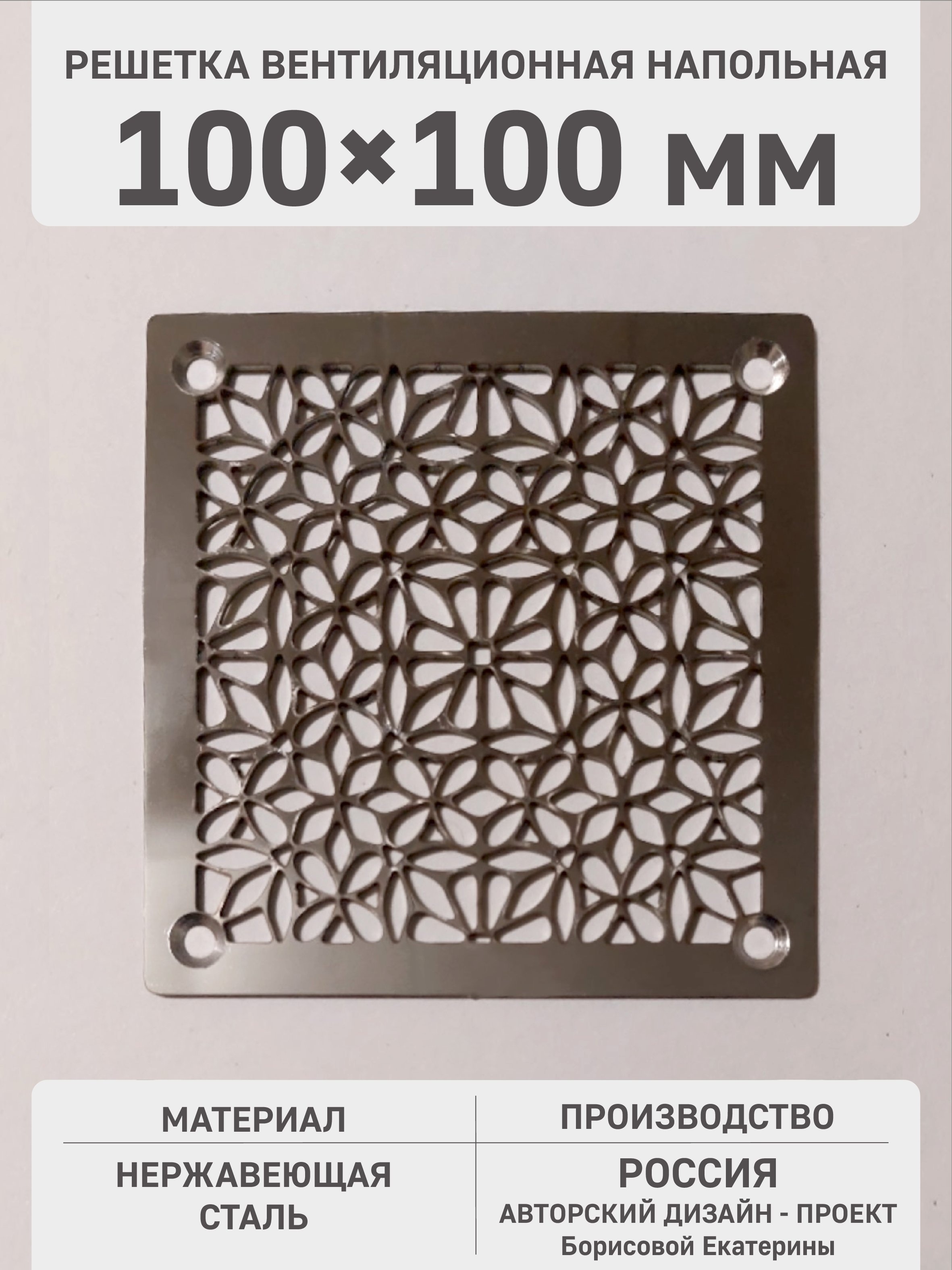Произведена из высококачественной нержавеющей стали AISI 304 (1,5 мм) с использованием точной перфорации. Изящный цветочный рисунок не препятствует воздушному потоку (площадь сечения ~32%), добавляя помещению уюта и стиля.