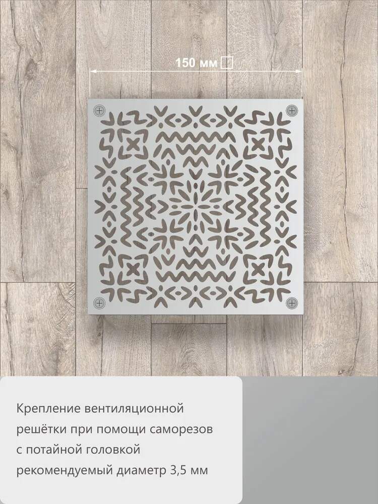 В комплект входит: Решётка вентиляционная «Весенний орнамент» 150×150 мм - 1 шт.